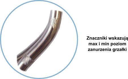 Grzałkę należy zanurzyć tak, aby poziom wody znajdował się pomiędzy znacznikami umieszczonymi na rurce.